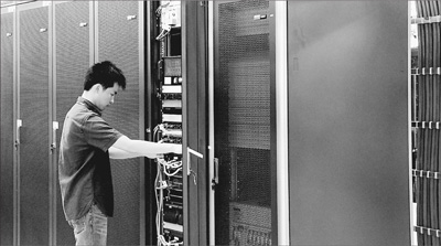 在东南亚电信(柬埔寨)有限公司建设的云数据中心里,工作人员正在调试设备。本报记者 张志文摄
