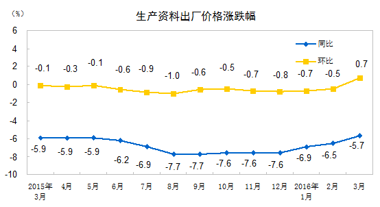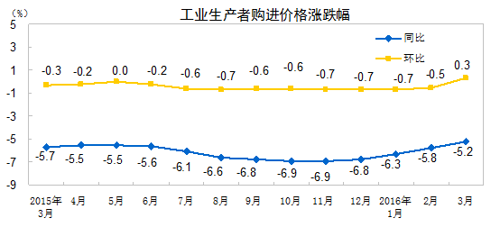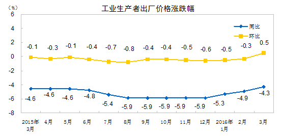 北京4月11日讯 国家统计局网站消息,2016 年 3 月份,全国工业生产者出厂价格环比上涨 0.5% ,同比下降 4.3% 。工业生产者购进价格环比上涨 0.3% ,同比下降 5.2% 。 1-3 月平均,工业生产者出厂价格同比下降 4.8% ,工业生产者购进价格同比下降 5.8% 。