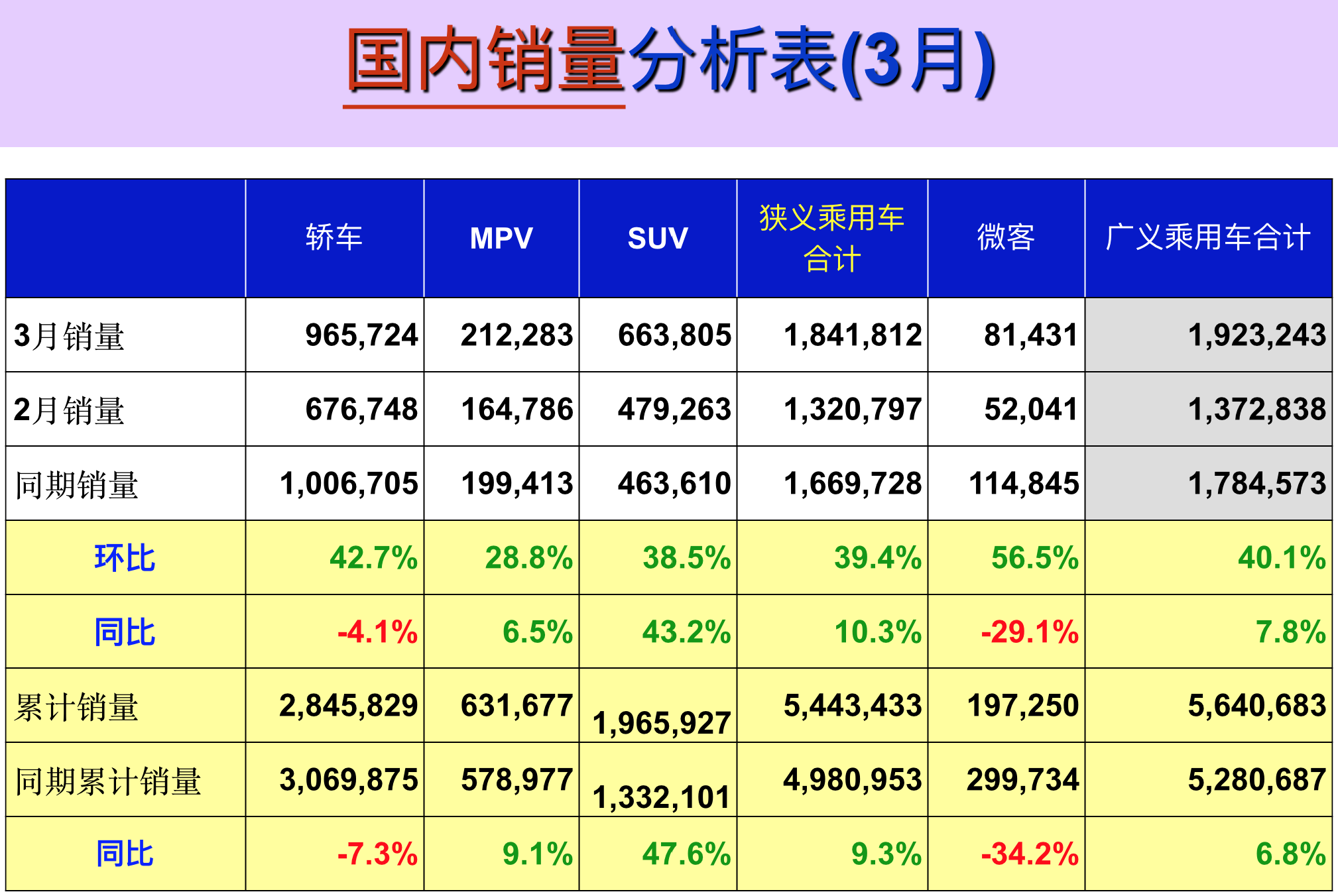 全国乘用车市场信息联席会(以下简称“乘联会”)于昨日发布的产销数据显示,2016年3月乘用车行业呈现产销推动式发展的态势。全国广义乘用车3月销售192.3万辆,同比增长7.8%。其中,SUV和MPV车型销量相较去年同期有不同程度的增幅,轿车销量则呈持续下降的趋势。