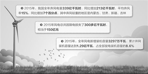 2015年,我国全年弃风电量339亿千瓦时,同比增加213亿千瓦时,平均弃风率15%,同比增加7个百分点,其中弃风较重的地区是内蒙古、甘肃、新疆、吉林。对我国风电产业来说,2000小时是个槛,如果利用小时低于这个数,开发企业的压力就会增大。据中国风能协会秘书长秦海岩透露,2015年风电总共因限电损失了300多亿千瓦时。