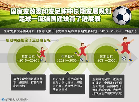 11日,国家发改委印发《中国足球中长期发展规划(2016-2050年)》(以下简称《规划》),“壮大足球产业”被列入《规划》,并辅以多项配套政策。