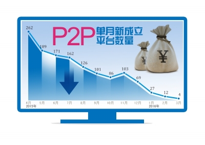 京华时报讯(记者马文婷)银率网日前发布统计报告显示,2016年3月全国新成立P2P平台共4家,环比上月减少66.7%。截至2016年3月底,全国正常运营平台共2572家,连续四个月负增长。