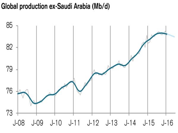 瑞信分析师Ed Westlake和Jan Stuart 周三通过一张图向市场显示,全球原油产量(不包括沙特)在2016年已经放缓至8300万桶/天,而这一数字在2015年中期为8400万桶/天。