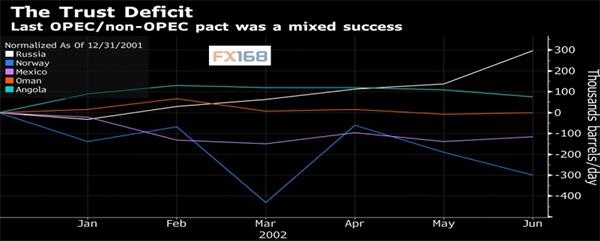 2001年末OPEC曾与其他非OPEC产油国达成协议,当时俄罗斯、墨西哥、也门、安哥拉和挪威曾承诺每日减产50万桶。但在随后一年的年中,俄罗斯就无视协议增加产量,而遵守减产承诺的国家只有墨西哥和挪威,恰恰这两个国家都不会参加本周日的多哈会议。