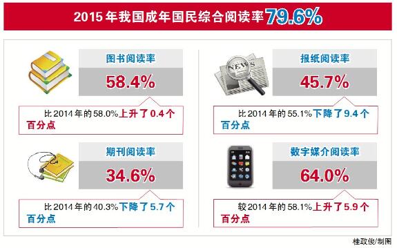 调查数据显示:2015年,我国成年国民图书阅读率为58.4%,较2014年上升0.4个百分点;数字化阅读方式的接触率为64.0%,较2014年上升5.9个百分点;各媒介综合阅读率为79.6%,较2014年上升1个百分点。