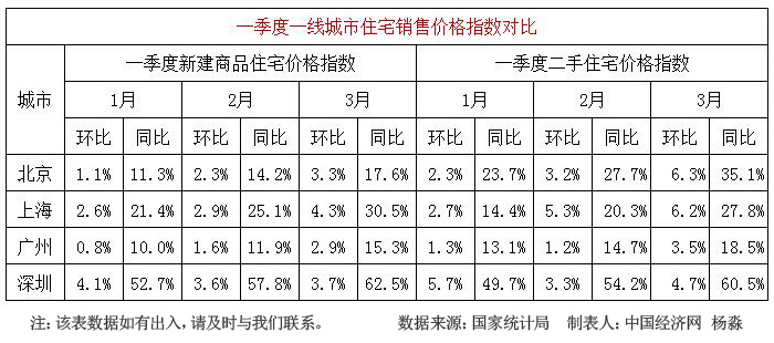 据中国经济网统计一季度一线城市房价情况发现,北上广深四大城市一季度新建商品住宅价格指数同比均超过10%。