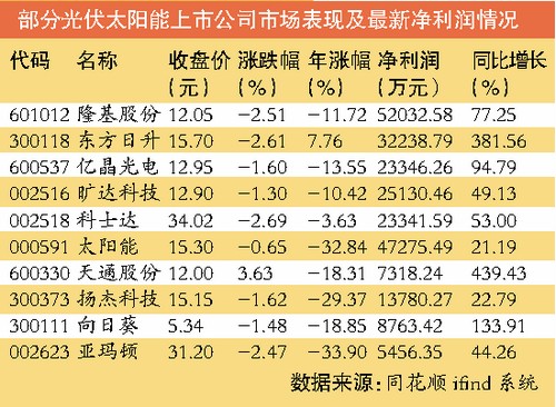 “股价下跌,业绩上升,再加上国家政策扶持,可能为光伏太阳能行业未来股价回升提供机会。”华泰联合证券市场分析人士对广州日报记者表示。有机构人士建议适当关注一些净利润和预收账款增长超预期的个股,对绩差股还是需要谨慎对待。