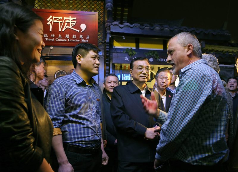 4月25日晚8时20分许,一辆中巴车悄然停在成都宽窄巷的巷口。李克强及随行10多人走下车来。像一位游客一样,他一连走访了几家小店铺,并买了几样别具特色的旅游纪念品和书籍。在一间啤酒屋前,他还向一位外国游客推荐起了中国的“青岛啤酒”。