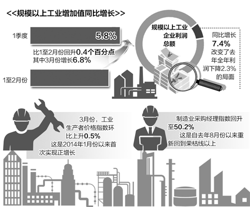 去年,我国工业增速和效益表现曾让人“捏了把汗”。今年以来,这两项工业关键指标均呈明显改善迹象,工业生产缓中趋稳、企业效益回升。数据显示,一季度,规模以上工业增加值同比增长5.8%,比1至2月份回升0.4个百分点,其中3月份增长6.8%;规模以上工业企业利润总额同比增长7.4%,改变了去年全年利润下降2.3%的局面,而且3月份的利润比1至2月份还要好。