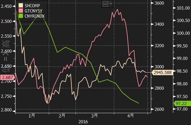 5五年期国债收益率(红线),上证指数(黄线),CFETS指数(绿线)