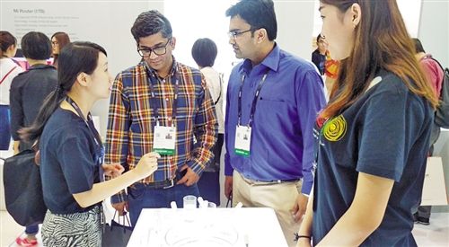 下图 印度观众对小米展台展出的智能水质检测计满怀兴趣。 本报记者 陈 静摄