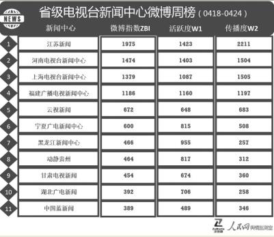 省级电视台新闻中心微博榜排名情况如下:江苏新闻以微博指数1975高居榜首,并成为唯一指数接近2000的新闻中心,其中,活跃度以1423排名第一,传播度以2211同样排名第一。河南电视台新闻中心以微博指数1474位列第二,其活跃度以1403排名第二,传播度以1504位列第三。上海电视台新闻中心与福建广播电视新闻中心分别以1379与1186位列第三、第四。至此,共4家新闻中心微博指数破1000。