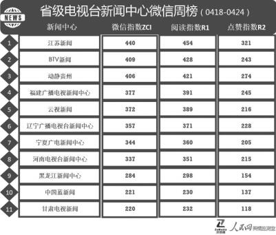 微信指数破400的共有3家新闻中心。江苏新闻以微信指数440夺得省级电视台新闻中心微信周榜冠军,其阅读指数以454排名第一,点赞指数以321同样排名第一。BTV新闻以409荣获微信榜亚军,其阅读指数428排名第二,点赞指数243排名第四。动静贵州由上一次的第六升至第三,微信指数406,其中阅读指数以421排名第三,点赞指数以274排名第二。福建广播电视新闻中心微信指数排名第四。云视新闻与辽宁广播电视台新闻中心分别位列第五、第六。至此,微信指数在350以上的共6家。