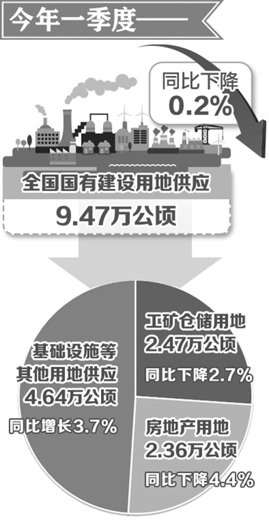 数据显示,一季度工矿仓储用地2.47万公顷,同比下降2.7%;房地产用地2.36万公顷,同比下降4.4%;基础设施等其他用地供应4.64万公顷,同比增长3.7%。