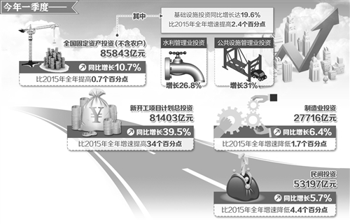 今年以来,类似成都新机场这样的重大固定资产投资呈较快增长态势。据5月4日国家发改委网站公布的数据显示,一季度,全国固定资产投资(不含农户)85843亿元,同比增长10.7%,比2015年全年提高0.7个百分点。其中,基础设施投资同比增长达19.6%,比2015年全年增速提高了2.4个百分点。