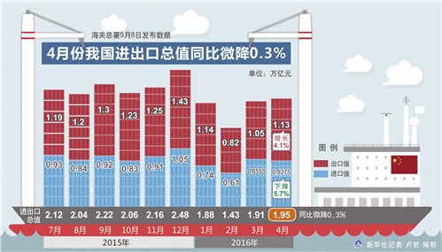 今年前4个月,我国进出口总值7.17万亿元,同比下降4.4%。其中,出口4.14万亿元,下降2.1%;进口3.03万亿元,下降7.5%;贸易顺差1.11万亿元,扩大16.5%。