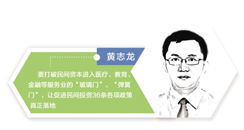 黄志龙:近年来,相关部门一直在基础设施领域推广公私合营(PPP),但效果并不明显,主要问题可能还是民营企业仍然处于弱势地位,其盈利前景得不到保障。未来在推行PPP过程中,政府部门应该换位思考,把民间资本导入到有稳定现金流和收益的项目中来,避免民间资本成为旁观者。同时,要打破民间资本进入医疗、教育、金融等服务业的“玻璃门”、“弹簧门”,让促进民间投资36条各项政策真正落地。
