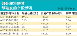 将于5月27日定增解禁的国金证券,以最新收盘价计算,自发行以来股价跌幅高达49.29%(后复权);将于6月13日定增解禁的石化机械,以最新收盘价计算,自发行以来股价跌幅高达52.22%。