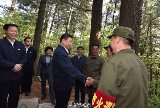 习近平来到上甘岭林业局溪水国家森林公园,实地察看天然林保护情况。他走进红松林深处,同正在巡山的护林员进行交流,了解他们的工作生活情况。