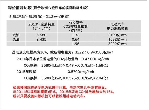 马自达技术开发总负责人人见光夫今年2月在日本广岛举办的“马自达技术论坛”上,也表示“电动车对环保几乎没有意义”。他的逻辑依据依然是电力的来源结构,在日本现在的发电能源构成为例依然以火电为主,电动汽车间接造成的碳排放几乎与传统内燃机汽车一样。