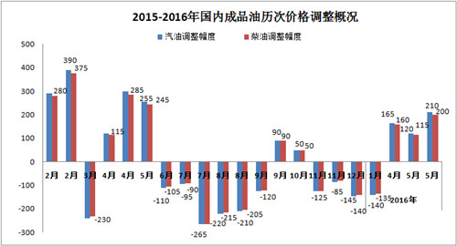据发改委通知,自2016年5月25日24时起,国内汽、柴油价格每吨分别提高210元和200元。