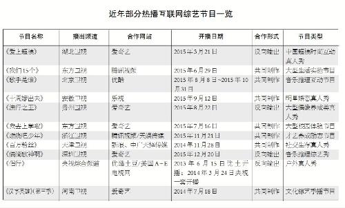 随着一系列关于媒体融合的政策指导出台,表明媒体融合的讨论已经从学术层面进入到中央决策层。互联网综艺节目开始大爆发,数量大有超越各大卫视综艺节目之势。2015年,中国进入了互联网自制综艺2.0时代,“大投入、精制作、媲美电视综艺”的优质节目已经诞生,越来越高的点击率和关注度让互联网综艺节目成为视频网站着力发展的方向。从爱奇艺反输湖北卫视的《爱上超模》,东方卫视与腾讯视频共同制作的《我们15个》,到优酷为北京卫视打造的《歌手是谁》;从乐视网和安徽卫视以双平台之力打造明星婚恋真人秀《十周嫁出去》到爱奇艺与贵州卫视联合播出的偶像养成类真人秀《流行之王》,在电视台播出的新节目中,具有互联网基因的综艺节目不断增多,且合作形式多元化。例如,《十周嫁出去》在播出过程中由乐视网全程直播约会、领证和举办婚礼的全过程,安徽卫视则在周六晚推出精编周播版;贵州卫视《流行之王》作为一档偶像养成类真人秀,集户外真人秀、明星引领素人、团队对抗等多种模式于一身,互联网综艺节目与电视媒体的融合进一步加深。