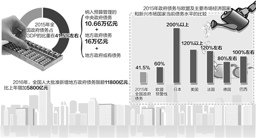 据介绍,截至2015年末,纳入预算管理的中央政府债务10.66万亿元,地方政府债务16万亿元,两项合计,全国政府债务26.66万亿元,占GDP的比重为39.4%。加上地方政府或有债务(即政府负有担保责任的债务和可能承担一定救助责任的债务),按照2013年6月审计署匡算的平均代偿率20%估算,2015年全国政府债务的负债率(债务/GDP)将上升到41.5%左右。