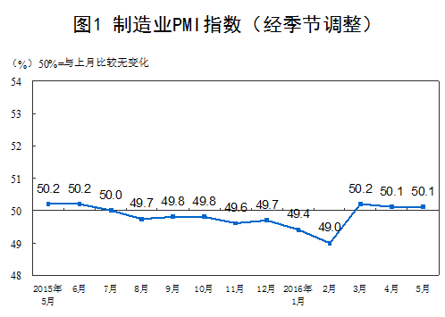 2016年5月份,中国制造业采购经理指数(PMI)为50.1%,与上月持平,连续三个月位于扩张区间。