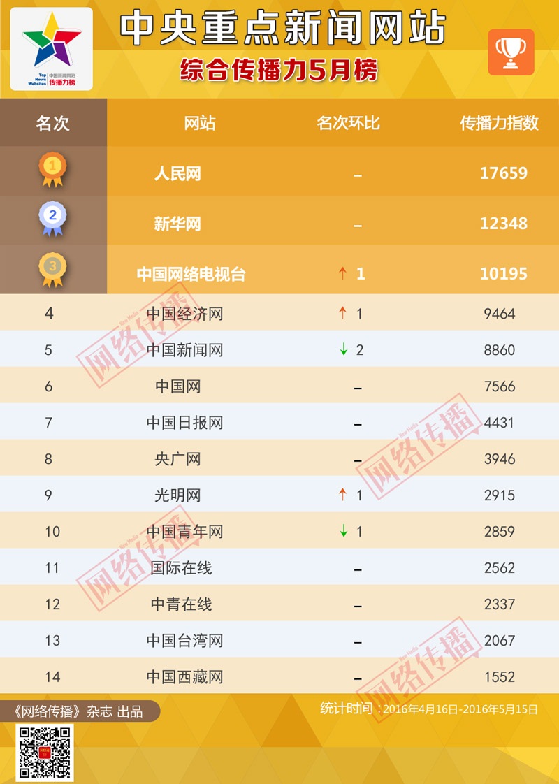 5月综合传播力榜显示,人民网、新华网继续稳居冠亚军;央视网和中国经济网名次环比均有1名上升,依次位列榜单第三、第四;中国新闻网名次环比下降2名居榜单第五;中国网、中国日报网、央广网三家网站本月名次未发生变动,继续排位第六、第七、第八;光明网和中国青年网本月名次出现对调,光明网名次环比上升1名居榜单第九,中国青年网名次环比下降1名居榜单第十;十名之外依次仍是国际在线、中青在线、中国台湾网、中国西藏网。