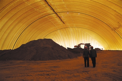2015年4月9日,北京焦化厂修复方修建膜结构大棚,工人们将污染土壤在密闭车间内进行破碎、筛分等预处理工作。新京报记者 王贵彬 摄
