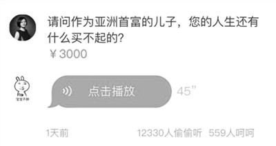 “作为亚洲首富的儿子,您的人生还有什么买不起的?”有网友“悬赏”3000元邀请万达集团董事长王健林的儿子王思聪回答这个问题。而只要花上1块钱,你就能听到他的答案。