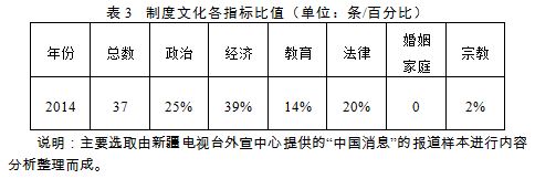通过对《新疆新闻联播》报道内容的制度文化各项指标分析统计,得出表3。