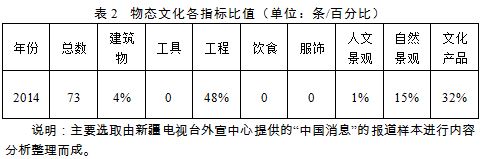 通过对《新疆新闻联播》报道内容的物态文化各项指标分析统计,得出表2。