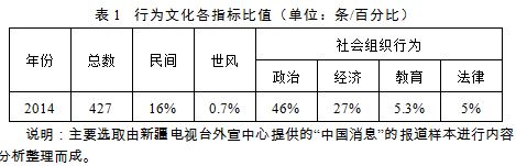 通过对《新疆新闻联播》报道内容的行为文化各项指标分析统计,得出表1。