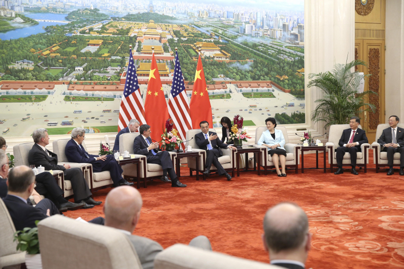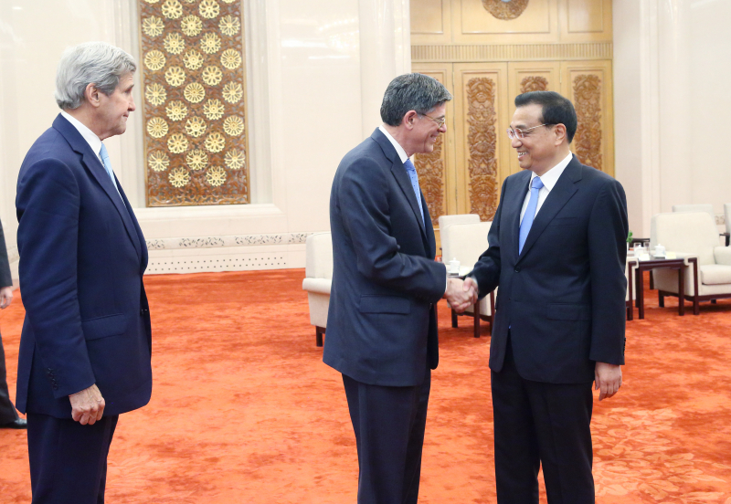 国务院总理李克强7日下午在人民大会堂会见来华出席第八轮中美战略与经济对话、第七轮中美人文交流高层磋商的美国国务卿克里和财政部长雅各布·卢。