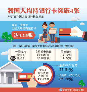 中国人民银行7日报告显示,截至一季度末,全国人均持有银行卡突破4张,达4.15张;移动支付发展势头迅猛,一季度,银行业金融机构共处理电子支付业务303.22亿笔,金额793.97万亿元。其中,移动支付业务笔数涨幅明显,同比增长308.08%达56.15亿笔,金额同比增长31.05%达52.13万亿元。(沈 明)