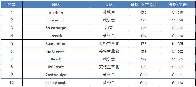 另一方面,位于苏格兰的Airdrie房价最低,每平米价格仅有1019英镑,这个数字连肯辛顿地区房价的十分之一都不到——以下表格为每平米房价最便宜的10个地区: