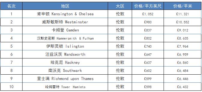 与全国的251%的20年每平米房价增长率相比,伦敦地区的涨幅达到了432%,是除英格兰南部以外其他地区的2倍多。算了一下相当于伦敦地区年均涨幅为7.5%,如果加上房租收益,投资伦敦房产20年预计年化收益超过10%,再如果加上50%的资金是贷款的话,收益真的是杠杠的。伦敦各个市政区中哈克尼(Hackney)地区每平米房价增速最快,1996年至今价格翻了821%,犹如光速…32个行政区中有17个区的房价都高于5000英镑/平米。以下为全英每平米房价最值钱的前10个地区: