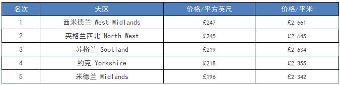 不过,即便是房价相对较低的地区,家用住宅每平米房价也都在1000英镑以上。以下为除伦敦和英格兰外其他大区每平米房价排行榜: