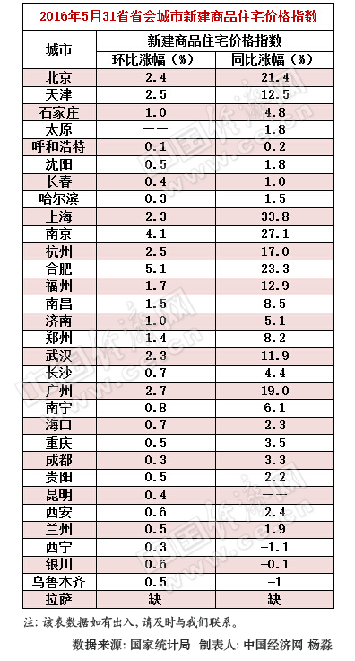 从表格来看,今年5月31省省会城市新建商品住宅价格指数与2015年比较,北京、上海、合肥、南京在内的4个城市房价的同比增长幅度比较大,分别增长了21.4%、33.8%、23.3%、27.1%,涨幅均超过20%。中国经济网发现,与去年相比,房价同比跌幅最大的城市是西宁,跌幅为1.1%。