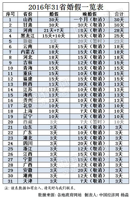 另外,中国经济网还特别关注了河南省与黑龙江省,两个省份在修改本省的计生条例时对婚假的规定增加了对于参加婚前医学检查的夫妻增加婚假7天和10天的规定,使得河南省和黑龙江省婚假天数仅次于山西和甘肃。据中国经济网统计,河南可休28天,黑龙江婚假可以休25天。