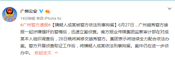 6月27日,广州越秀警方接报一起涉嫌强奸的警情后,迅速立案侦查。南方报业传媒集团监察审计部在对成某本人组织调查后,28日晚将其移交越秀警方。集团表示将继续全力配合依法办案。警方开展侦查取证工作后,将嫌疑人成某依法刑事拘留。案件仍在进一步调查。