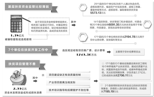 同样以扶贫工作为例,审计发现的主要问题:一是部分资金分配未充分考虑建档立卡贫困人口情况。比如,有的扶贫资金分配尚未与建档立卡贫困人口数据建立有效衔接机制,在具体扶贫项目实施中,有的地方也未严格按规定条件筛选扶贫对象。在抽查云南省寻甸县2015年发放的1339笔扶贫到户贴息贷款6560万元中,仅有711笔3433万元(占52%)发放给了建档立卡贫困户;二是有1.51亿元扶贫资金被虚报冒领或违规使用;三是有8.7亿元扶贫资金闲置或损失浪费。