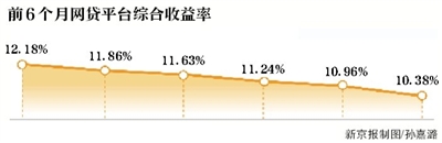与热钱滚滚涌入形成鲜明对比的是,上半年网贷行业综合收益率不断下降。根据网贷之家的数据,今年前6个月,综合收益率分别为12.18%、11.86%、11.63%、11.24%、10.96%与10.38%。