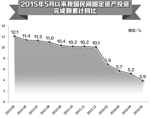 今年以来,我国民间投资增速明显下滑。1月至5月,民间固定资产投资同比名义增长3.9%,增速比2015年回落6.2个百分点;民间固定资产投资占全国固定资产投资的比重为62.0%,比去年同期降低3.4个百分点。