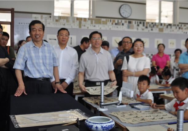 当白塔小学李晓东校长向苏士澍主席介绍他们学校为传承中华民族文化,将书法教学引入课堂,并利用每节语文课,拿出十分钟进行写字教学指导,同时在3-6年级每周开设一节软笔书法课,由专职书法教师任教授课,苏士澍主席给与了充分的肯定,他说:“我们若每个小学设立专门的书法老师,全国需要50-60万老师,如从语文老师中培养兼职书法老师,既可以提升老师的书写能力和对中国文字的精准认知,又可节省大量办学师资”。随后苏士澍主席来到白塔小学“写字派书法云教室”,这个由沈阳市教育基金会和社会爱心人士捐资10万元建造的现代授课教室,将写字派引入书法课堂,依托互联网技术,实现师生之间,同学之间的交互,真正体现了“小课堂,大世界”。