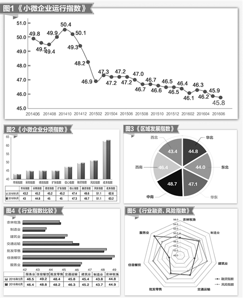 2016年6月份,“经济日报-中国邮政储蓄银行小微企业运行指数”(见图1)为45.8,较上月下降0.1个点,降幅较上月收窄0.2个点,表明6月小微企业总体运行继续下行。