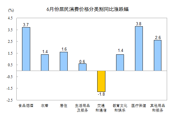 6 月份,其他七大类价格同比六涨一降。其中,医疗保健、其他用品和服务、居住、衣着、教育文化和娱乐、生活用品及服务价格分别上涨 3.8% 、 2.6% 、 1.6% 、 1.4% 、 1.4% 、 0.6% ;交通和通信价格下降 1.8% 。