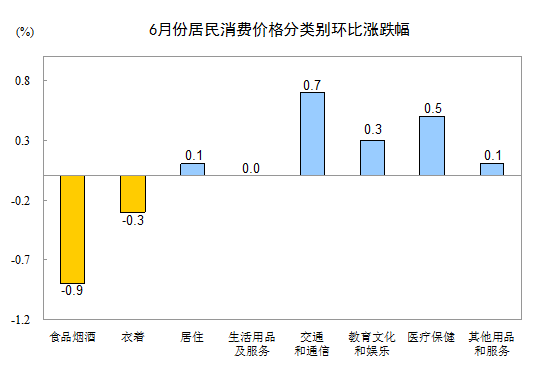 6 月份,其他七大类价格环比五涨一降一平。其中,交通和通信、医疗保健、教育文化和娱乐、居住、其他用品和服务价格分别上涨 0.7% 、 0.5% 、 0.3% 、 0.1% 、 0.1% ;衣着价格下降 0.3% ;生活用品及服务价格持平.