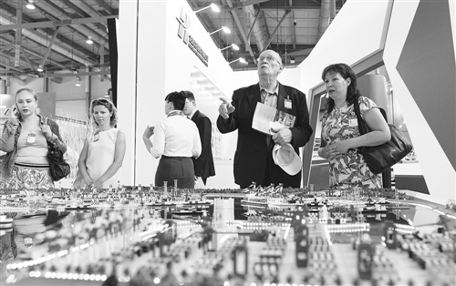 7月11日,在俄罗斯叶卡捷琳堡,人们参观营口港展台。第三届中国—俄罗斯博览会11日在俄罗斯叶卡捷琳堡市开幕。这是中俄博览会首次在俄罗斯举行。新华社记者 白雪骐摄